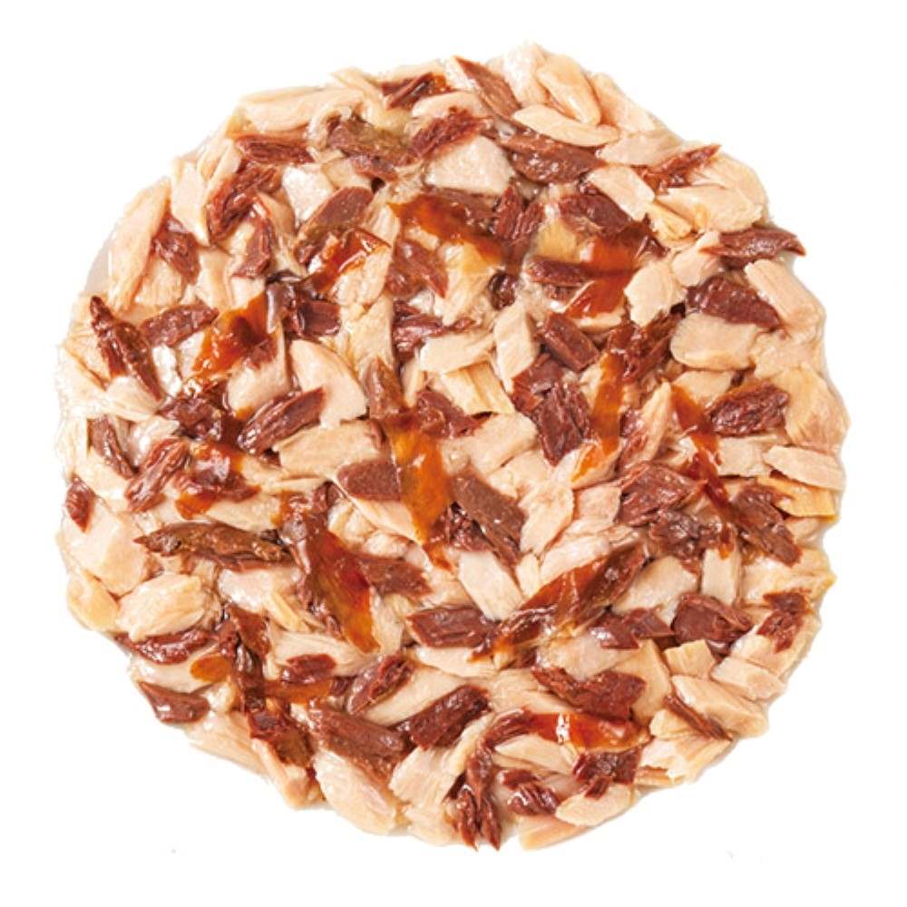 本まぐろを使用したプレミアムタイプのウェットフード。血合肉の一部に本まぐろを使用し、かつお節をトッピングしました。おいしさを引き立てるまぐろやほたてのエキスを使用。グルメなねこちゃんも大満足の美味しさです。ビタミンE、オリゴ糖配合。緑茶消臭成分配合。