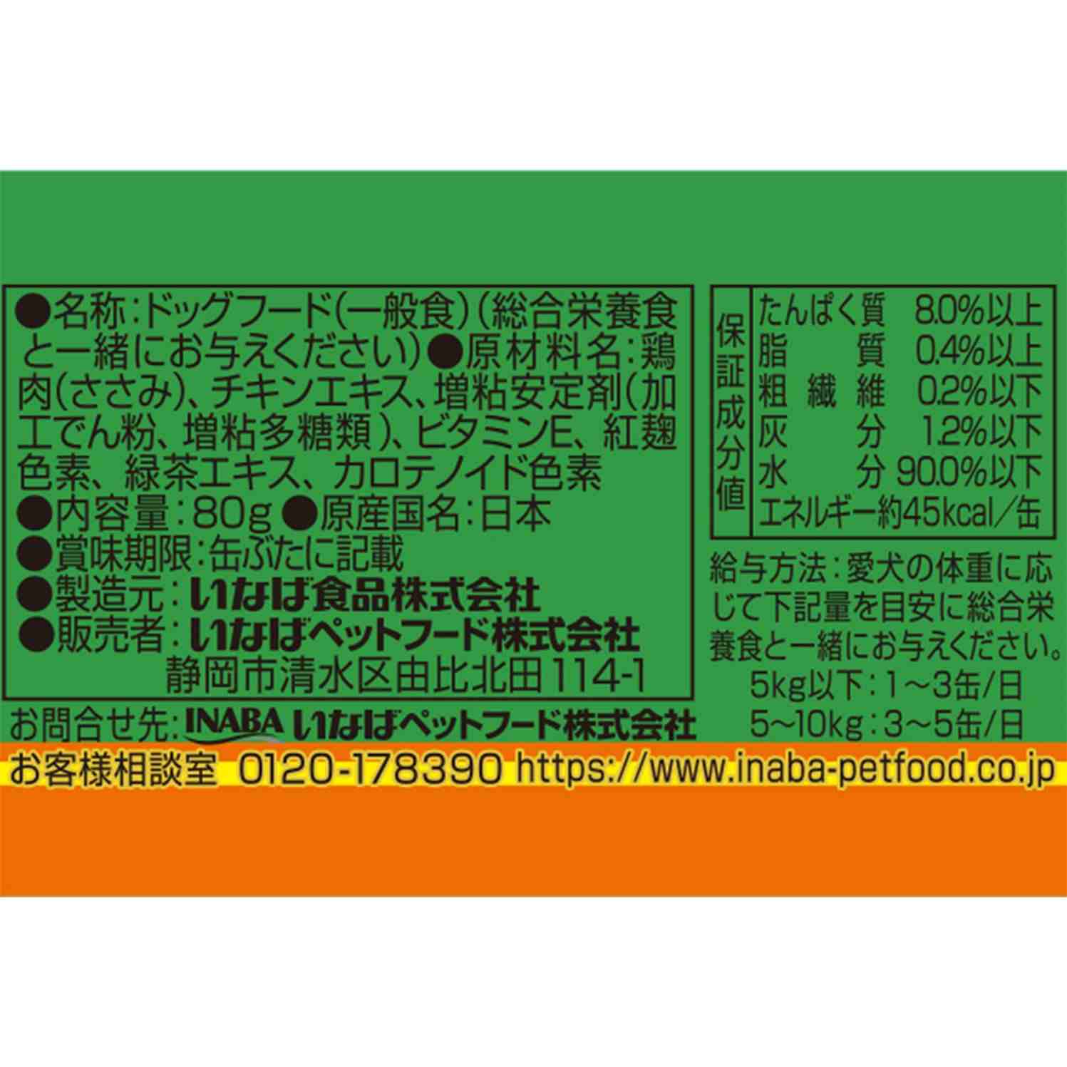 鶏肉(ささみ)、チキンエキス、増粘剤(加工デンプン)、増粘多糖類、ビタミンE、紅麹色素、緑茶エキス、カロテノイド色素たんぱく質8.0%以上、脂質0.4%以上、粗繊維0.2%以下、灰分1.2%以下、水分90.0%以下