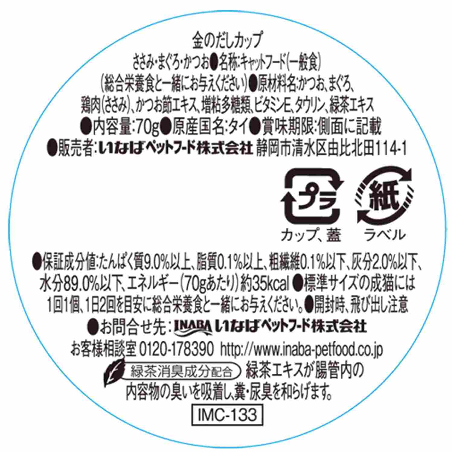 原材料かつお、まぐろ、鶏肉(ささみ)、かつお節エキス、増粘多糖類、ビタミンE、タウリン、緑茶エキスたんぱく質9.0%以上、脂質0.1%以上、粗繊維0.1%以下、灰分2.0%以下、水分89.0%以下