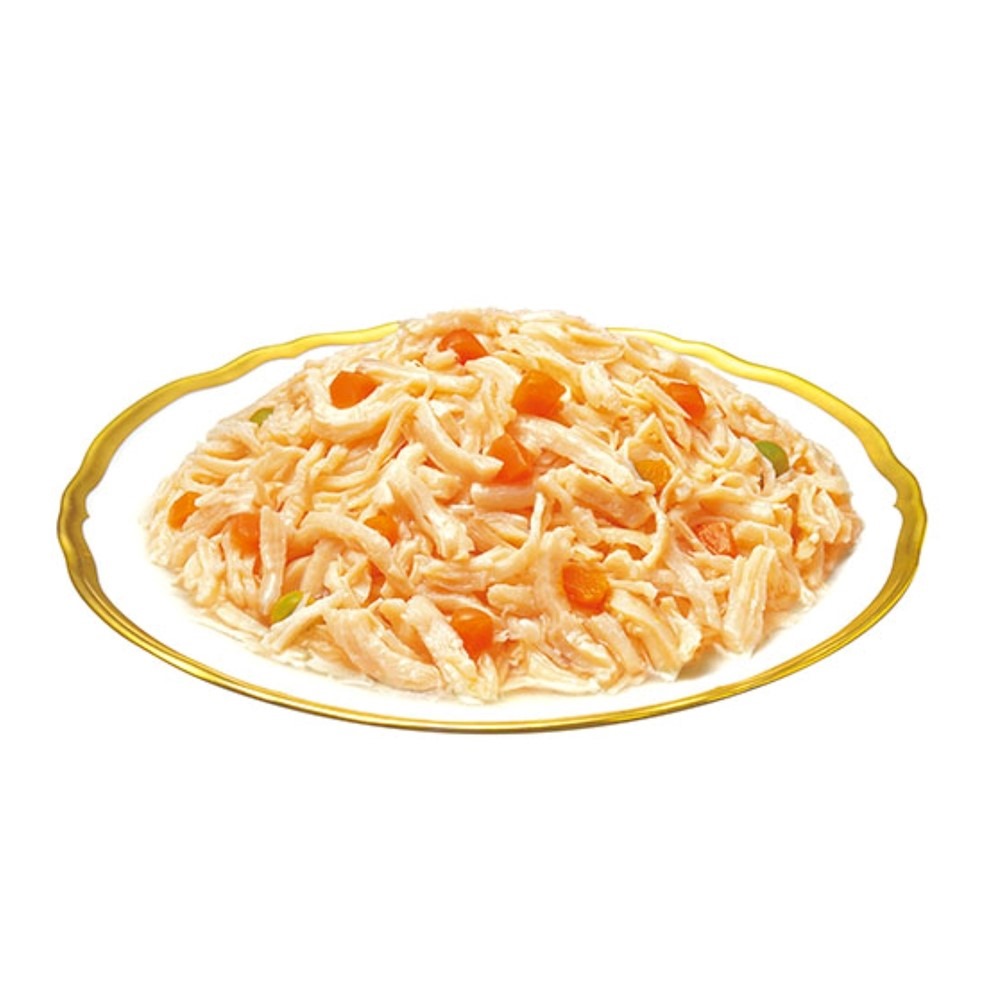 鶏肉(ささみ)、野菜(人参、かぼちゃ、グリンピース)、鶏脂、でん粉、チキンエキス、寒天、オリゴ糖、コラーゲンペプチド、殺菌乳酸菌、ミネラル類(CA、FE、Cu、Mn、Zn、I、K、Mg、SE)、増粘多糖類、ビタミン類(A、D3、E、B1、B2、B6、葉酸、B12、コリン、ビオチン)、グルコサミン、コンドロイチン硫酸塩、ミルクカルシウム、紅麹色素、緑茶エキス