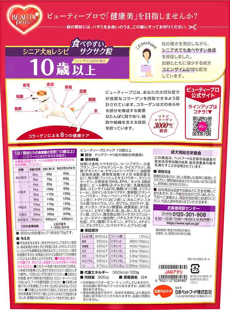 優れた栄養バランスで健康維持。食べやすいサクサク粒。フード選びは健康の基本。こだわったつもりでも、 ペットのカラダの変化は意外とわかりづらいもの。だから、ビューティープロは「届かせる」までこだわります。 実感を追求した栄養バランスで、健康を保ち、自然免疫*1をケア。さらに、コラーゲンが内側から毛先までうるおいを届けます。*1 自然免疫とは、生まれつき備わっている自然から授かった免疫機能です。