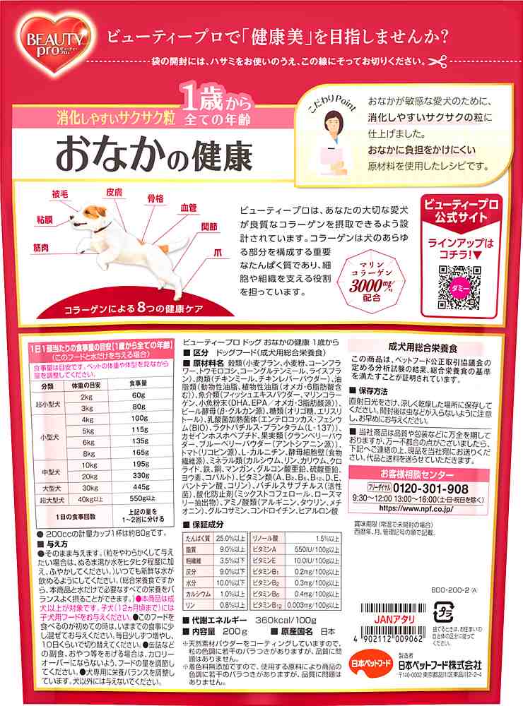 食物繊維強化(成犬用比)で健康的な便の維持に配慮。フード選びは健康の基本。こだわったつもりでも、 ペットのカラダの変化は意外とわかりづらいもの。だから、ビューティープロは「届かせる」までこだわります。 実感を追求した栄養バランスで、健康を保ち、自然免疫*1をケア。さらに、コラーゲンが内側から毛先までうるおいを届けます。*1 自然免疫とは、生まれつき備わっている自然から授かった免疫機能です。