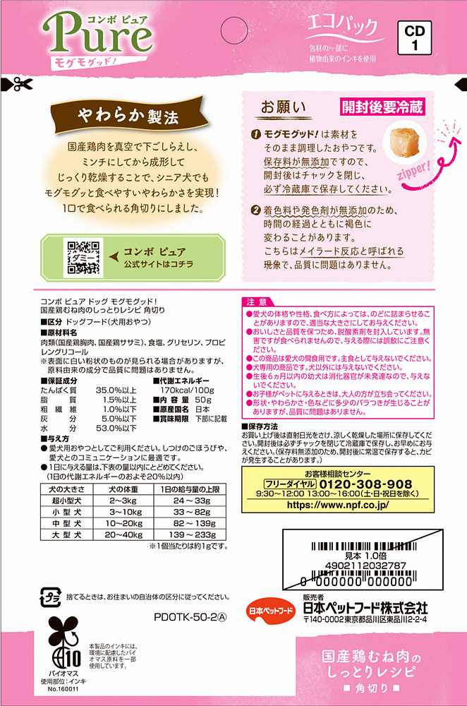 モグモグやわらかい角切りジャーキー。国産鶏むね肉のレシピ。着色料・保存料・香料・発色剤無添加でおいしく仕上げました。研究・開発から製造まで、国内で行っています。ごまかさないおいしさで、何気ないごはんの時間が待ち遠しくなる。ごはんも、おやつも「コンボ ピュア」。