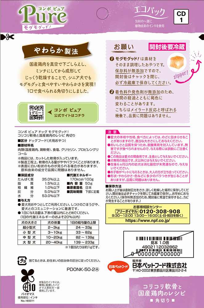 モグモグやわらかい角切りジャーキー。国産鶏むね肉&軟骨入り。着色料・保存料・香料・発色剤無添加でおいしく仕上げました。研究・開発から製造まで、国内で行っています。ごまかさないおいしさで、何気ないごはんの時間が待ち遠しくなる。ごはんも、おやつも「コンボ ピュア」。