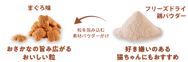 おさかなの旨みたっぷりのパウダーを贅沢に使用したまぐろ味粒。驚きのおいしさを実現しました。