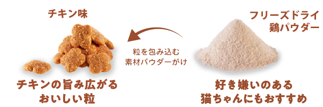 素材そのまま、栄養も損なわれないフリーズドライ鶏肉を削ったこだわりのパウダー入り。
