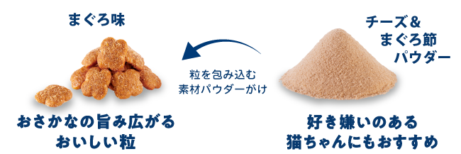 おさかなの旨みたっぷりのパウダーを贅沢に使用したまぐろ味粒。驚きのおいしさを実現しました。