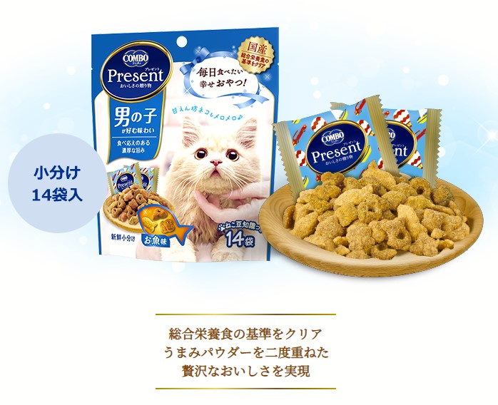 <原材料名>穀類(トウモロコシ、コーングルテンミール、小麦粉、パン粉)、肉類(チキンミール、牛肉粉、豚肉粉、チキンレバーパウダー)、油脂類(動物性油脂、植物性油脂)、魚介類(フィッシュミール、フィッシュパウダー、マグロ節粉、マグロエキス、小魚粉末、カツオエキス、シラスパウダー)、脱脂大豆、発酵うまみ調味料、オリゴ糖、ハーブ(タイム、ディル、フェンネル)、野菜類(トマト、ニンジン、ホウレンソウ)、クランベリーパウダー、pH調整剤、ミネラル類(カルシウム、リン、カリウム、ナトリウム、クロライド、銅、亜鉛、ヨウ素)、アミノ酸類(タウリン、トリプトファン、メチオニン)、ビタミン類(A、B1、B2、B6、B12、D、E、K、ニコチン酸、パントテン酸、葉酸、コリン)、酵母細胞壁、着色料(二酸化チタン、食用赤色102号、食用赤色106号、食用黄色5号)、酸化防止剤(ミックストコフェロール、ローズマリー抽出物)、グルコサミン、コンドロイチン<保証成分>たんぱく質26.0%以上、脂質13.0%以上、粗繊維3.0%以下、灰分8.0%以下、水分10.0%以下、カルシウム0.7%以上、リン0.6%以上<代謝エネルギー>約11kcal/小分け1袋<原産国>日本≪与え方≫●おやつとして与える場合は、いつもの食事量を減らすなど調整をした上、表を目安にお与えください。●月齢が2ヵ月~10ヵ月の子ねこに主食として与える場合は、成猫時体重1kgあたり35g/日を目安にお与えください。(小袋1袋は約3gです)●猫専用に栄養バランスを調整しています。猫以外には与えないでください。【1日1頭当たりの量の目安】