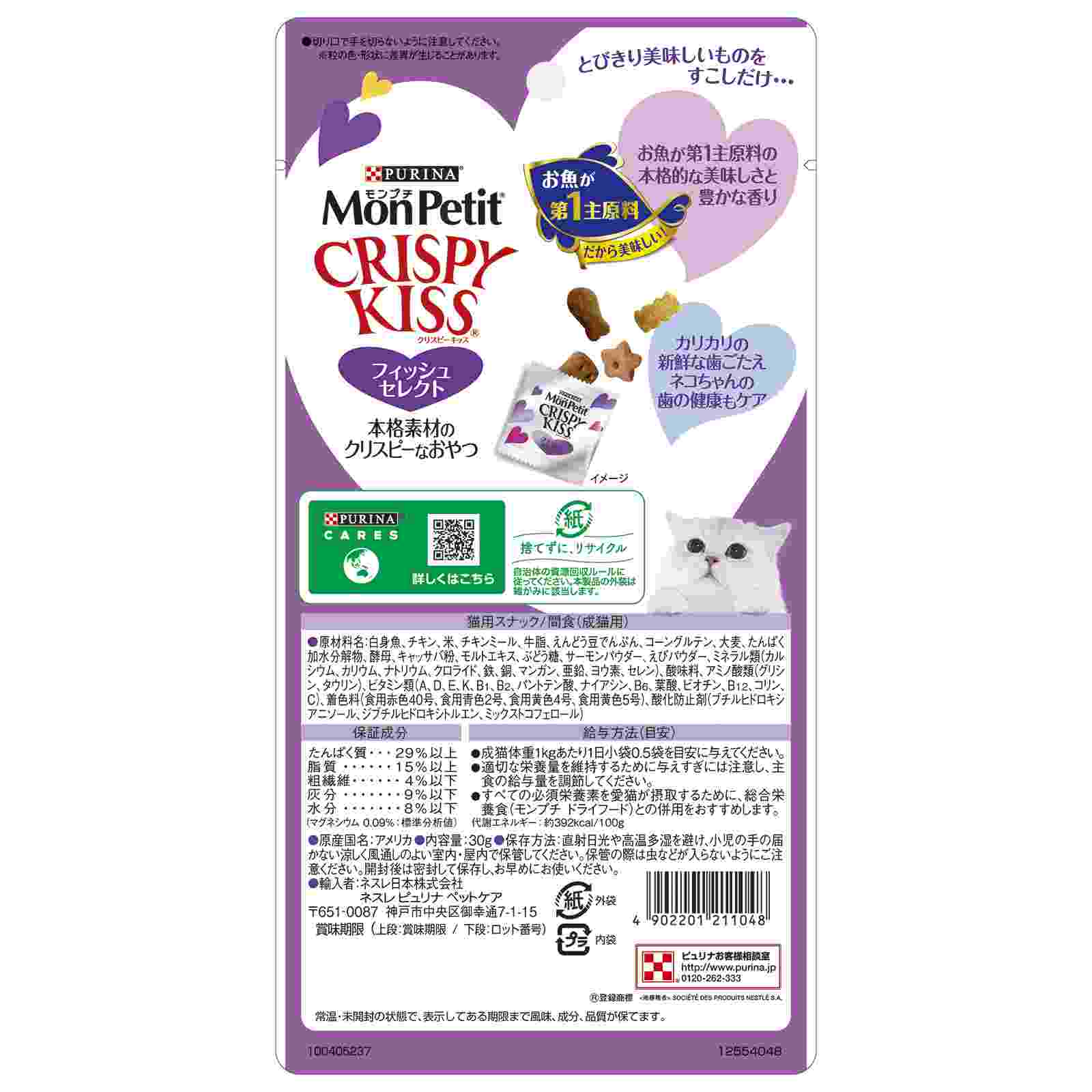 お魚を第1主原料に使用した、香り広がるクリスピーなおやつ。白身魚をたっぷりと使った濃厚なお魚の味にネコちゃんも大満足。カリカリの新鮮な歯ごたえで、ネコちゃんの歯の健康もケア。
