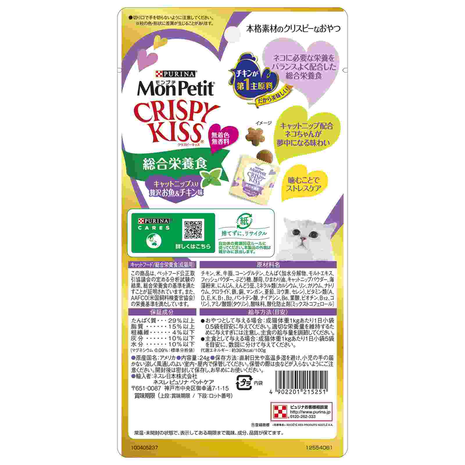 人気のモンプチ クリスピーキッスからネコちゃんに必要な栄養をバランスよく配合した総合栄養食登場。チキンを第一主原料にお魚の味わいが加わり、ネコちゃんが夢中になる美味しさ。キャットニップ配合。美味しくかんでストレスケアにも。無着色無香料。