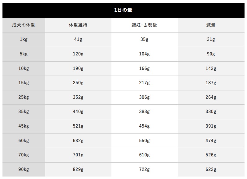 ・適切な体型を維持するために必要な量は、代謝量、犬種、体重、運動量、年齢や避妊・去勢の有無などによって異なります。