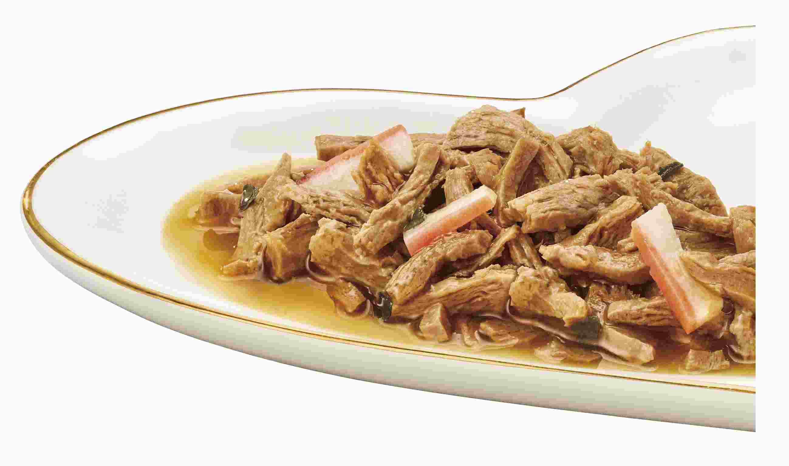 ~ほろっとコクうま煮込み~お肉やお魚、厳選素材をじっくり調理し、独自のシュレッドカット製法でほぐしました。深いコクとうまみ豊かなソース、魅力的なトッピングを添えた究極の一品。総合栄養食、合成着色料・香料無添加。