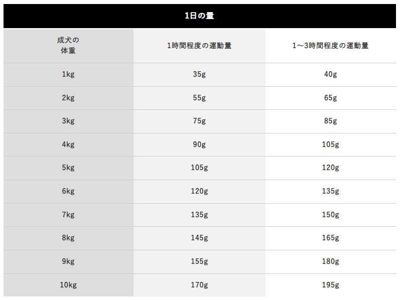 ・ピュリナの専門家は給与量を目安として提供しています。表の給与量で犬の体重が減少したり、増えすぎたりした場合は量を調節してください。