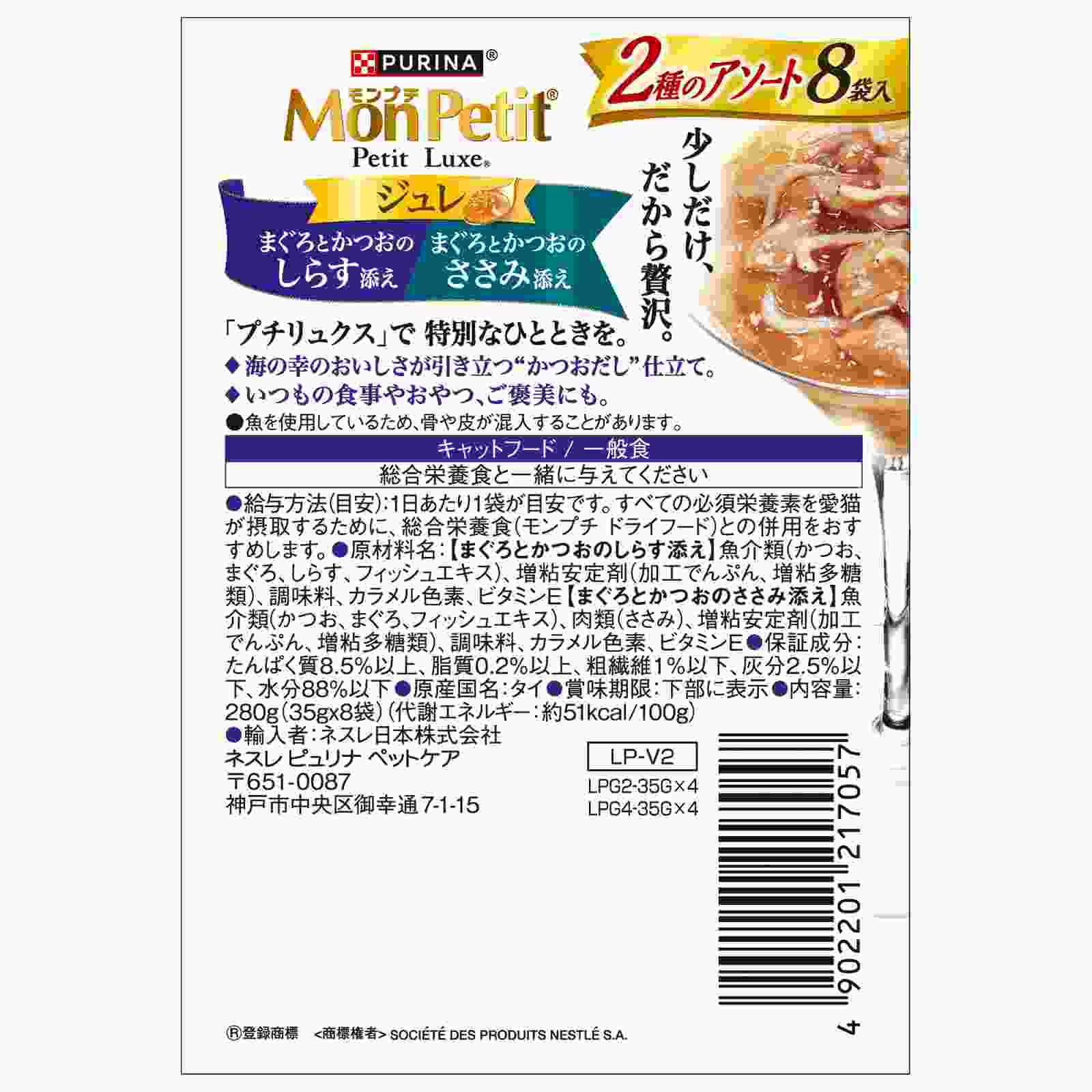 モンプチ プチリュクスパウチ ジュレ 2種のアソート まぐろとかつお しらす添え&ささみ添え 35g×8P