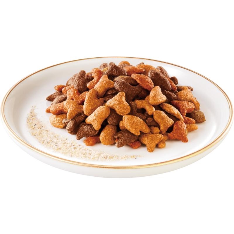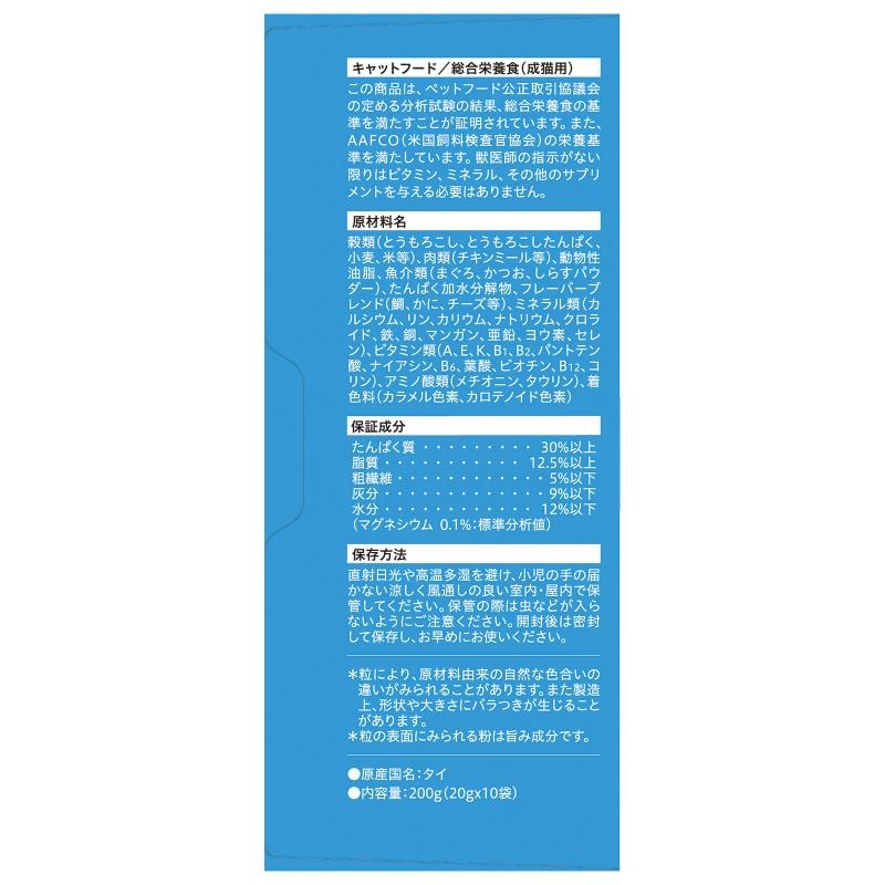 穀類(とうもろこし、とうもろこしたんぱく、小麦、米等)、肉類(チキンミール等)、動物性油脂、魚介類(まぐろ、かつお、しらすパウダー)、たんぱく加水分解物、フレーバーブレンド(鯛、かに、チーズ等)、ミネラル類(カルシウム、リン、カリウム、ナトリウム、クロライド、鉄、銅、マンガン、亜鉛、ヨウ素、セレン)、ビタミン類(A、E、K、B1、B2、パントテン酸、ナイアシン、B6、葉酸、ビオチン、B12、コリン)、アミノ酸類(メチオニン、タウリン)、着色料(カラメル色素、カロテノイド色素)