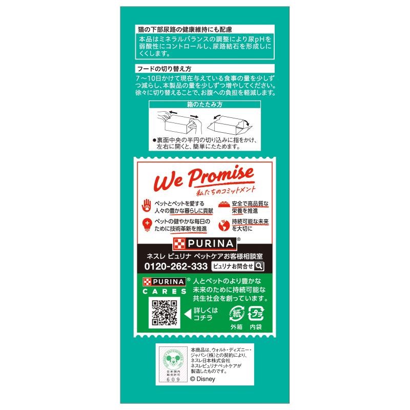 穀類(とうもろこし、とうもろこしたんぱく、小麦、米等)、肉類(チキンミール等)、動物性油脂、魚介類(まぐろ、かつお、かつお節、フィッシュパウダー、真鯛パウダー)、たんぱく加水分解物、フレーバーブレンド(かに、えび等)、ミネラル類(カルシウム、リン、カリウム、ナトリウム、クロライド、鉄、銅、マンガン、亜鉛、ヨウ素、セレン)、ビタミン類(A、E、K、B1、B2、パントテン酸、ナイアシン、B6、葉酸、ビオチン、B12、コリン)、アミノ酸類(メチオニン、タウリン)、着色料(カラメル色素、カロテノイド色素)