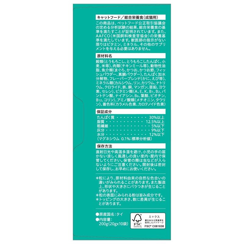 真鯛風味のかつお節チップ、そしてカリッとした食感がネコちゃんの食欲をそそる総合栄養食。合成着色料無添加。