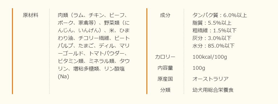 厳選されたビーフに栄養豊富なたまごとにんじんを加えて、子犬に食べさせやすいおいしさと柔らかさに仕上げました