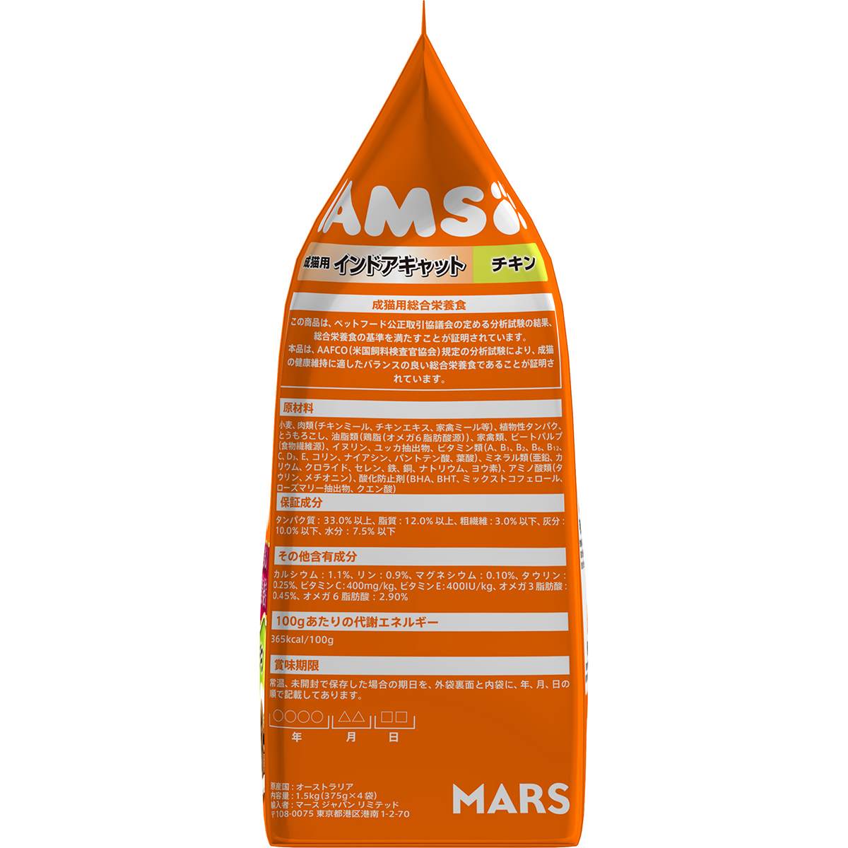 タンパク質:33.0%以上、脂質:12.0%以上、粗繊維:3.0%以下、灰分:10.0%以下、水分:7.5%以下