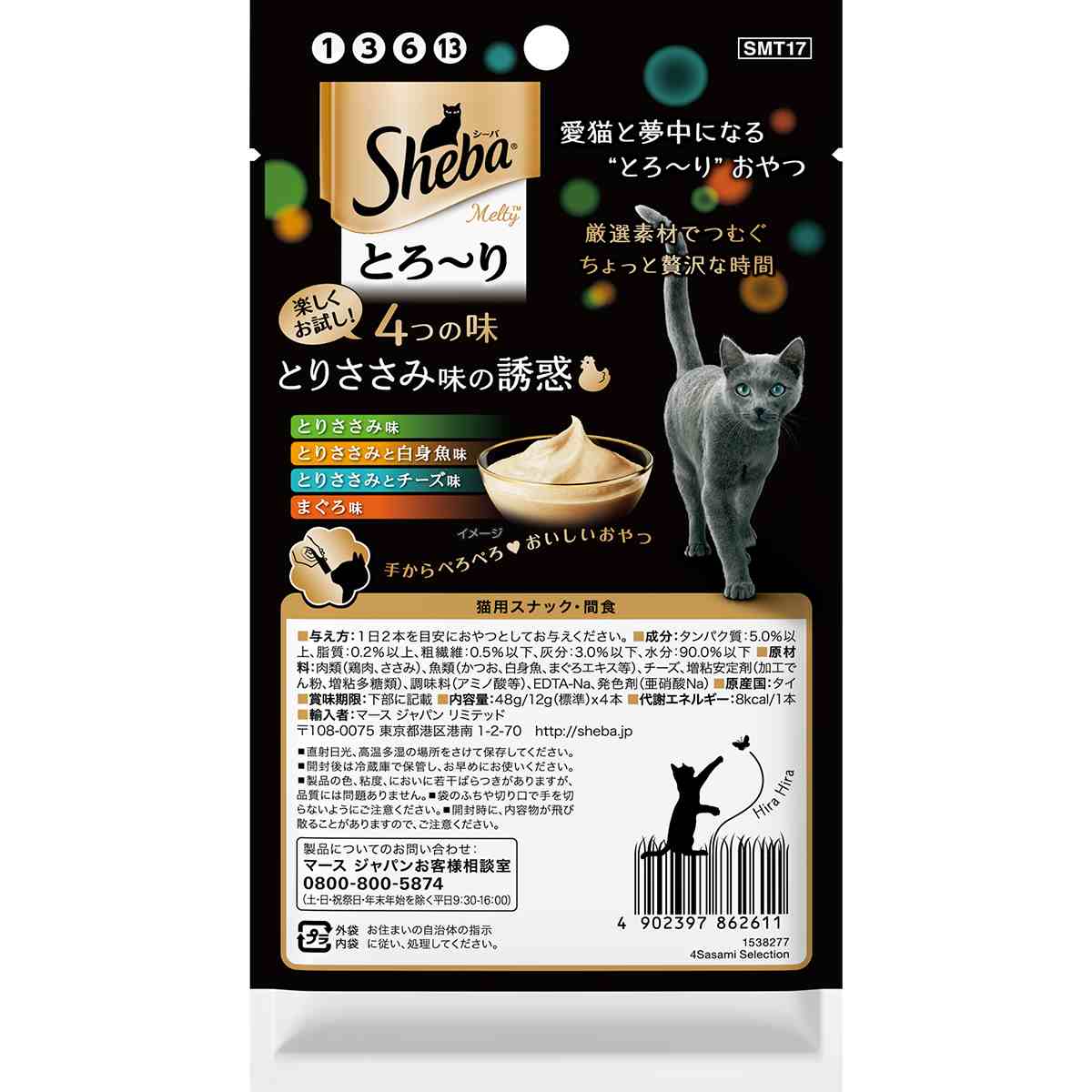 猫ちゃんが手からでも舐めやすい、贅沢なおいしさの“とろ~り”おやつ。1袋で、人気のとりささみ味を中心とした4種類を楽しみながら試せるセレクションタイプ。愛猫のお気に入りを見つけて!