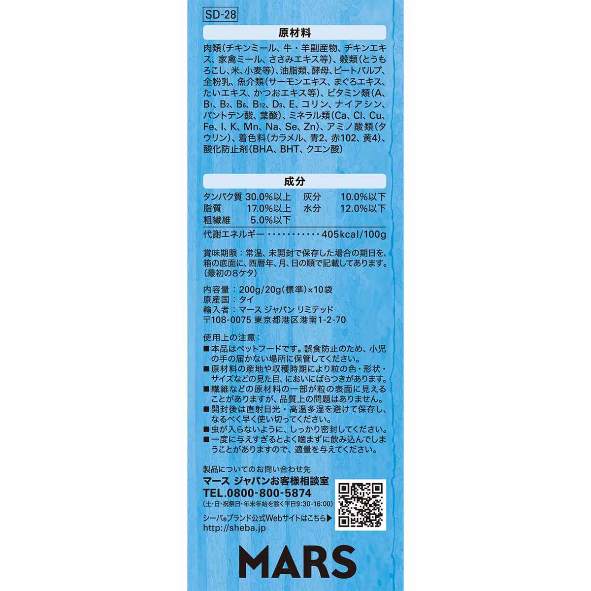 肉類(チキンミール、牛・羊副産物、チキンエキス、家禽ミール、ささみエキス等)、穀類(とうもろこし、米、小麦等)、油脂類、酵母、ビートパルプ、全粉乳、魚介類(サーモンエキス、まぐろエキス、たいエキス、かつおエキス等)、ビタミン類(A、B1、B2、B6、B12、D3、E、コリン、ナイアシン、パントテン酸、葉酸)、ミネラル類(Ca、Cl、Cu、Fe、I、K、Mn、Na、Se、Zn)、アミノ酸類(タウリン)、着色料(カラメル、青2、赤102、黄4)、酸化防止剤(BHA、BHT、クエン酸)