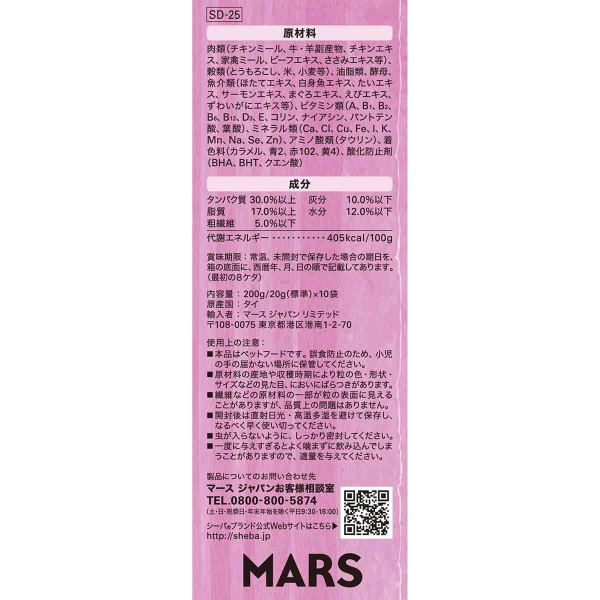 肉類(チキンミール、牛・羊副産物、チキンエキス、家禽ミール、ビーフエキス、ささみエキス等)、穀類(とうもろこし、米、小麦等)、油脂類、酵母、魚介類(ほたてエキス、白身魚エキス、たいエキス、サーモンエキス、まぐろエキス、えびエキス、ずわいがにエキス等)、ビタミン類(A、B1、B2、B6、B12、D3、E、コリン、ナイアシン、パントテン酸、葉酸)、ミネラル類(Ca、Cl、Cu、Fe、I、K、Mn、Na、Se、Zn)、アミノ酸類(タウリン)、着色料(カラメル、青2、赤102、黄4)、酸化防止剤(BHA、BHT、クエン酸)