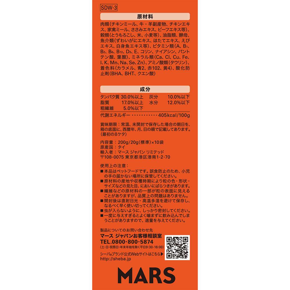 タンパク質:30.0%以上、脂質:17.0%以上、粗繊維:5.0%以下、灰分:10.0%以下、水分:12.0%以下