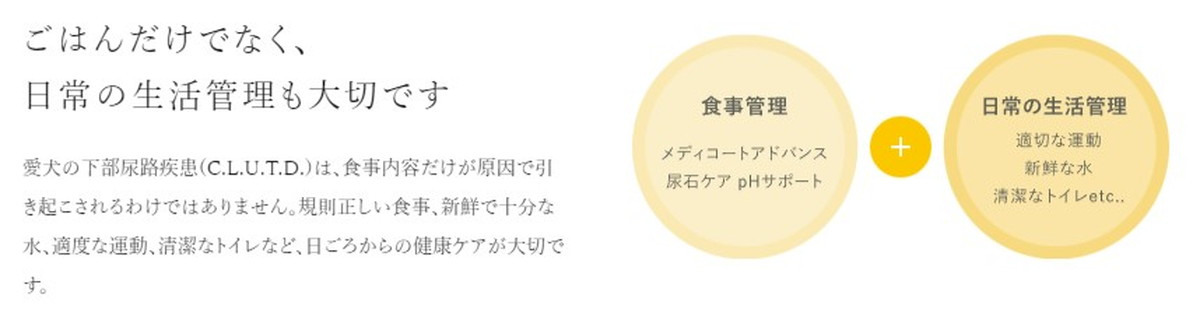 毎日のごはんでおしっこの悩みをケアする、国産プレミアムフード 愛犬にも意外と多い、"おしっこ"の悩み。 ぼうこうや尿道に結石ができると、深刻な問題につながる可能性もあります。 メディコートアドバンス「尿石ケアpHサポート」は、最適なミネラルバランスと栄養成分で下部尿路の健康維持やストルバイト結石に配慮し、愛犬の健康生活をサポートします。