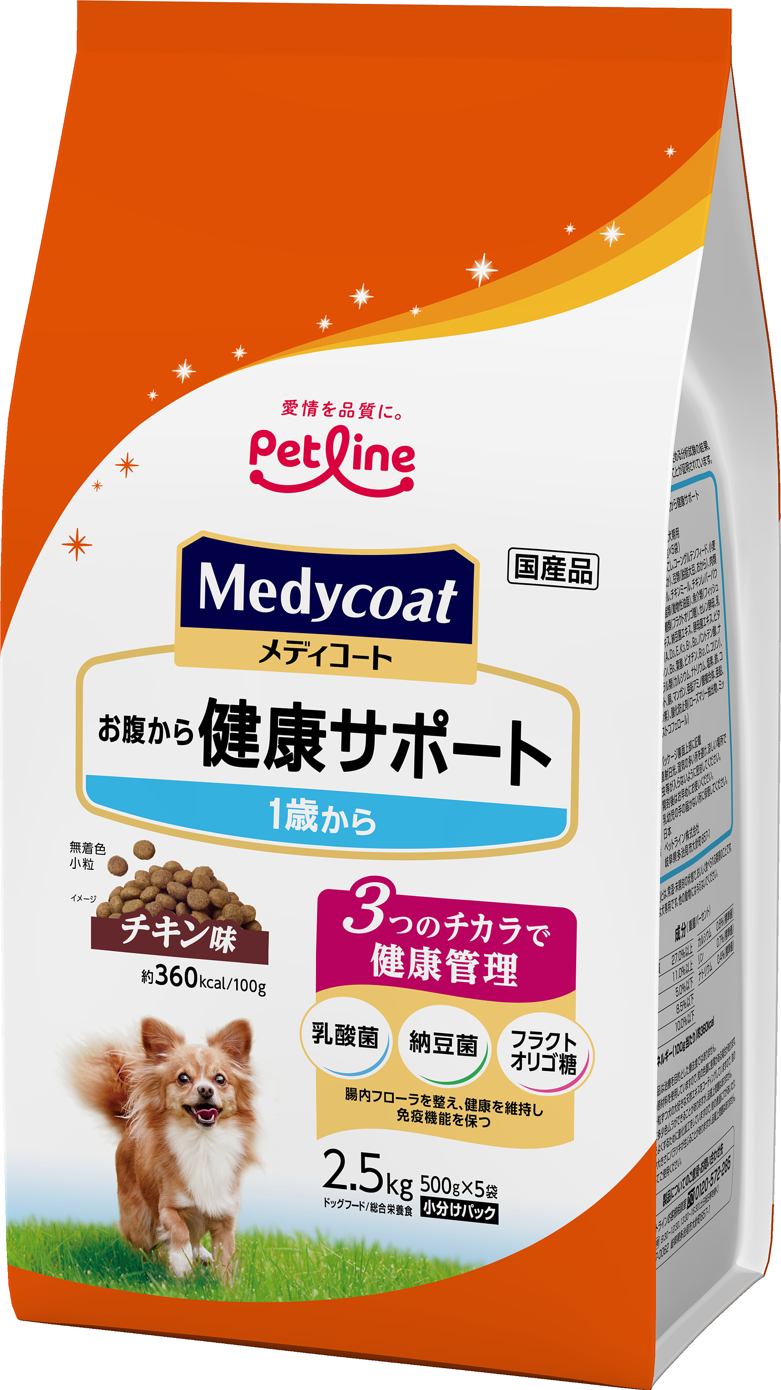 毎日食べるごはんだから、安心できるものをお届けしたい。 私たちは、そんな想いで、メディコートを作っています。 厳しい品質基準、国内生産のこだわり。 愛犬の健康を支えるために、たくさんの愛情と技術を注ぎました。 あなたの大切な家族へ。メディコートです。