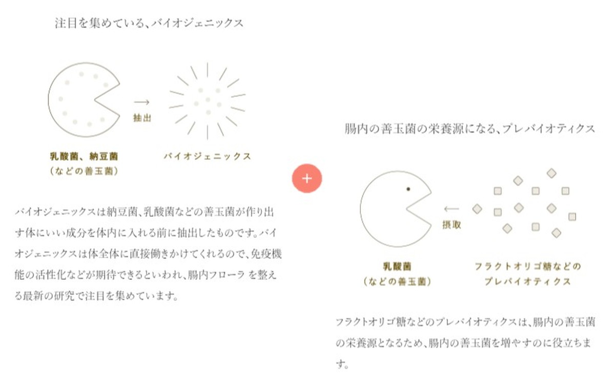 バイオジェニックスとして「乳酸菌」「納豆菌」、プレバイオティクスとして「フラクトオリゴ糖」を配合。