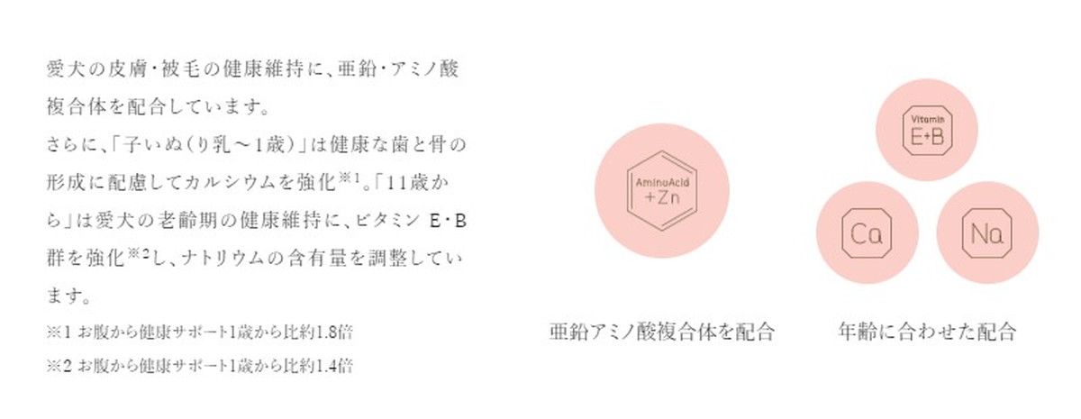 1歳からの愛犬に。 旨みたっぷり、チキン味。 皮膚・被毛の健康維持に亜鉛アミノ酸複合体を配合。