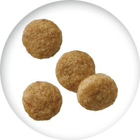 原材料穀類(小麦全粒粉、小麦粉、米粉、小麦ふすま、米ぬか)、豆類(脱脂大豆、おから)、肉類(ミートミール、チキンミール、チキンレバーパウダー)、油脂類(動物性油脂:ビーフオイル、フィッシュオイル:DHA・EPA源)、ビートパルプ、糖類(フラクトオリゴ糖)、β-グルカン、セレン酵母、乳酸菌、ビタミン類(A、D3、E、K3、B1、B2、パントテン酸、ナイアシン、B6、葉酸、ビオチン、B12、C、コリン)、ミネラル類(カルシウム、ナトリウム、塩素、鉄、コバルト、銅、マンガン、亜鉛アミノ酸複合体、亜鉛、ヨウ素)、アミノ酸類(メチオニン)、酸化防止剤(ローズマリー抽出物、ミックストコフェロール)