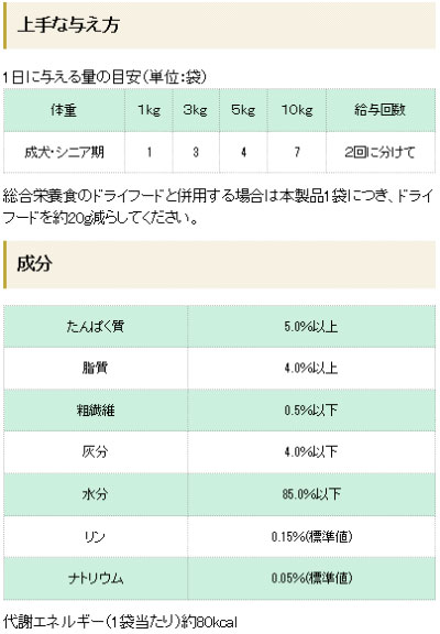 【原材料】 まぐろ、鶏ささみ、大豆油、ぶどう糖、かつお節、クリーム(原材料の一部に乳成分を含む)、 フィッシュコラーゲン、魚油:DHA源、オリゴ糖、ヨード卵粉末、野菜粉末、 ビタミン類(A、D3、E、K3、B1、B2、パントテン酸、ナイアシン、B6、葉酸、ビオチン、B12、コリン)、 ミネラル類(カルシウム、リン、ナトリウム、カリウム、塩素、鉄、銅、マンガン、亜鉛、ヨウ素)、 タウリン、増粘多糖類