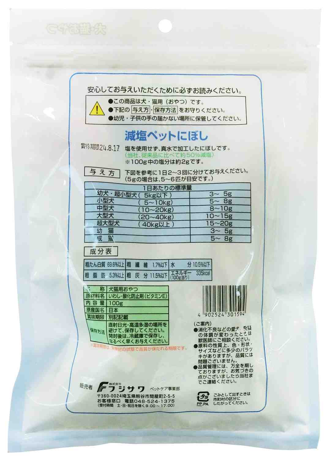 塩を使用せず、真水で加工したにぼしです。当社、従来品に比べ約50%減塩。100g中の塩分は約2gです。