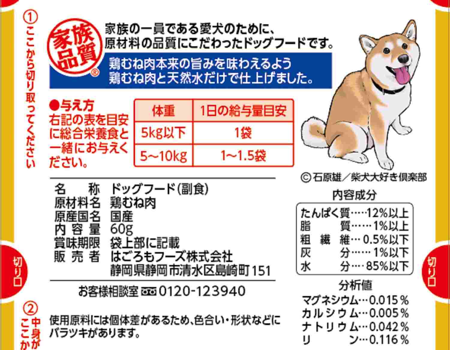 5~10kg1~1.5袋を目安に総合栄養食と一緒にお与えください。
