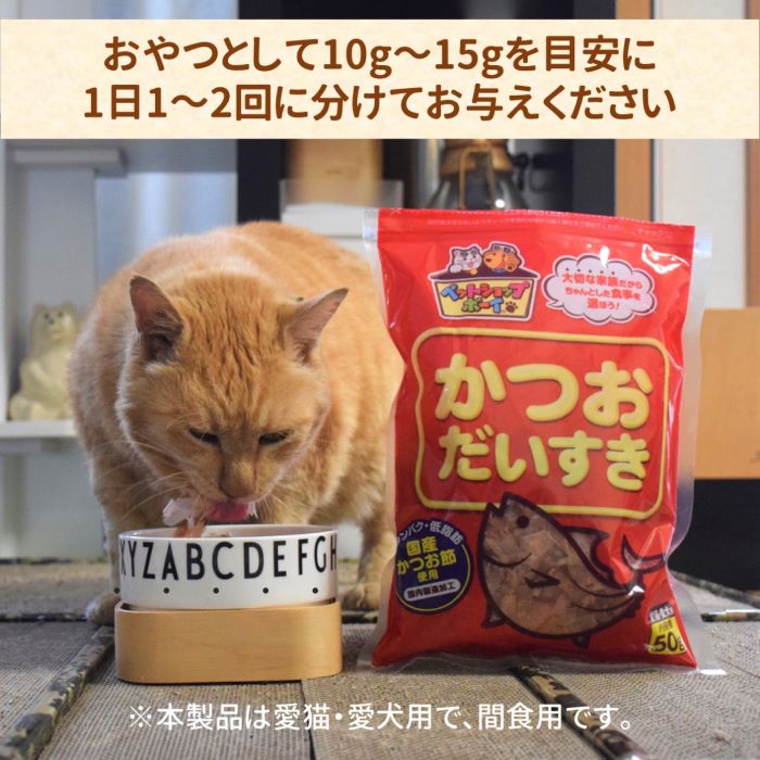 ●国産のかつお節を100%使用したおやつです。●薄くスライスしていますので食べやすく、おやつに最適です。●ドライタイプ・ウェットタイプのペットフード等へのふりかけ用としてもお与えいただけます。