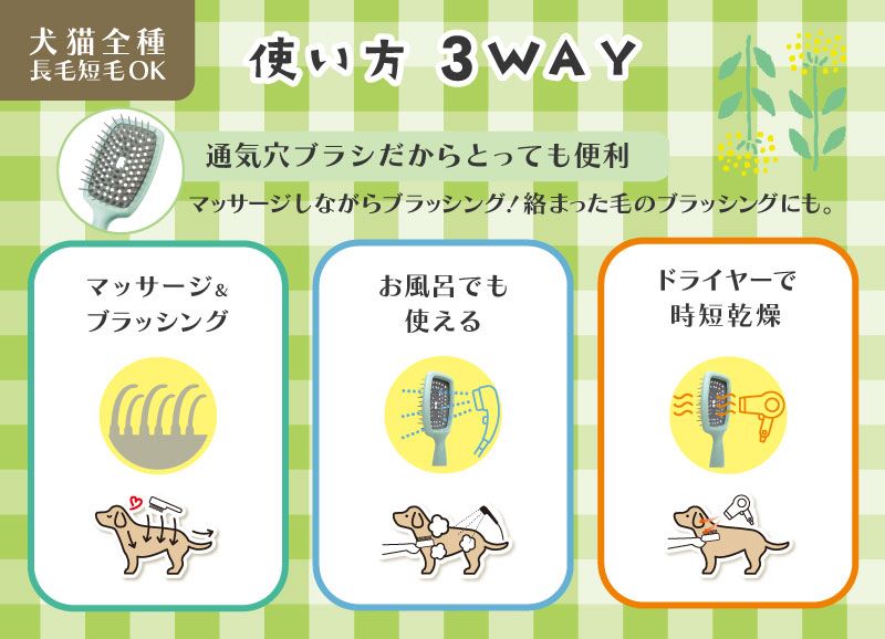 程よくしなるピンで地肌からマッサージ、猫ちゃんにもご使用いただけます。