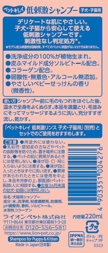 子犬・子猫から安心して使える低刺激シャンプー。