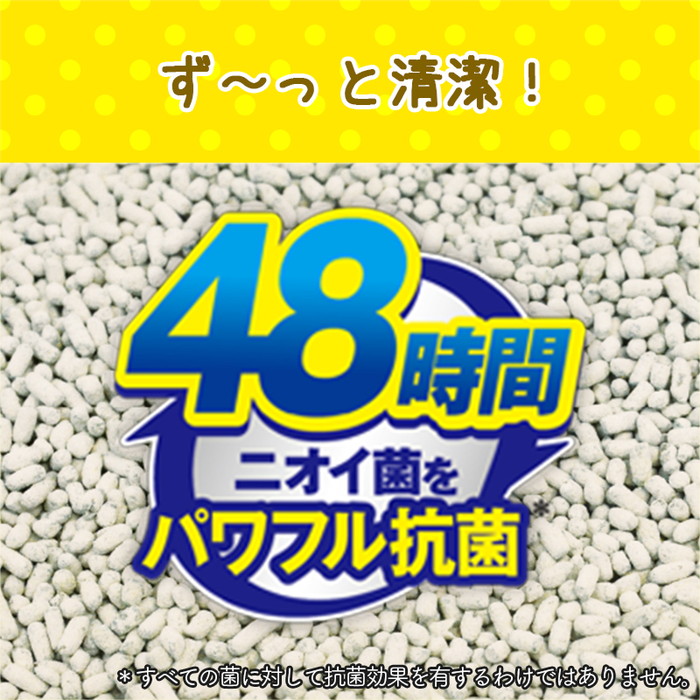 オシッコあとが緑色に変わる。*1鉱物製の猫砂。オシッコのあとが緑色に変わるから取り除きラクラク。48時間ニオイ菌をパワフル抗菌。*2オシッコやウンチのイヤなニオイをさわやかな香りに変える独自のハーモナイズド技術を採用。*1 カラーチェンジの色は、オシッコ自体の色味が薄いと青みがかって見える場合があります。*2 すべての菌に対して抗菌効果を有するわけではありません。