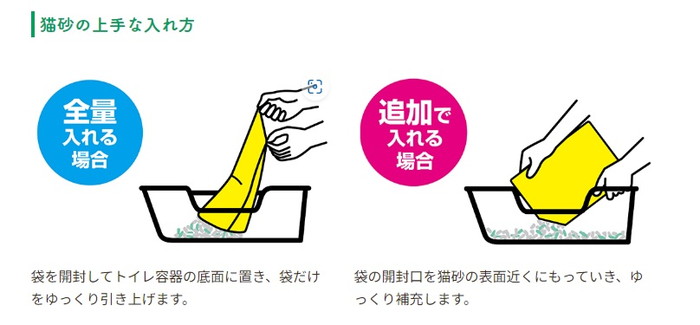 1.トイレ容器に厚さ5~6cmまで猫砂を入れます。2.猫が排泄すると猫砂が固まります。排泄物と固まった部分をスコップなどで取り除きます。3.取り除いた固まりと同量の猫砂を補充してください。