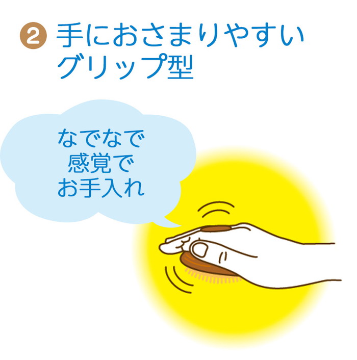 グリップを指の間に深く挟み、毛並みに沿ってやさしくマッサージするようにブラッシングする。