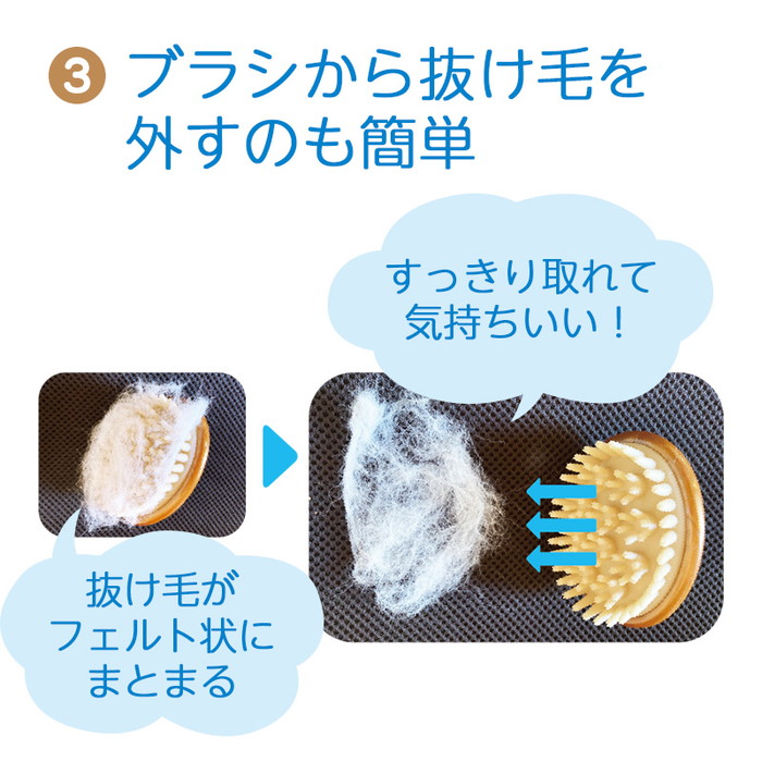 グリップを指の間に深く挟み、毛並みに沿ってやさしくマッサージするようにブラッシングする。※中央部は強めに押すと脱気されてくぼむので、使用時は元の状態に戻してから使用する。※ブラッシング剤等との併用もおすすめ。
