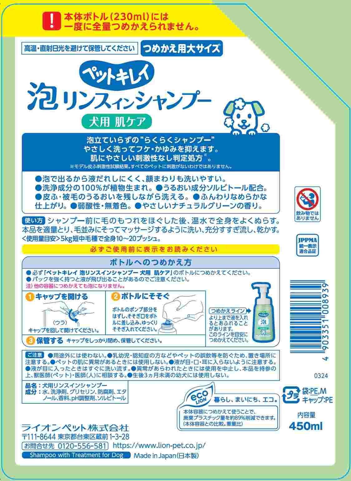 泡で出るから液だれしにくく、顔まわりも洗いやすい。洗浄成分の100%が植物生まれ。うるおい成分ソルビトール配合。皮ふ・被毛のうるおいを残しながら洗える。ふんわりなめらかな仕上がり。弱酸性・無着色。やさしいナチュラルグリーンの香り。
