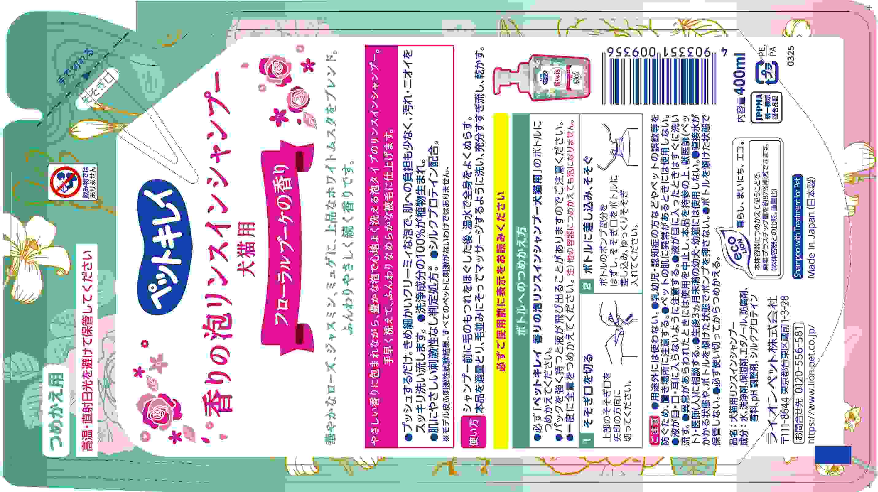 手早く洗えて、ふんわりなめらかな被毛に仕上げ る。きめ細かいクリーミィな泡で、肌への負担も 少なく手軽にシャンプー。汚れ・ニオイをスッキ リ落とす。洗浄成分の100%が植物生まれ。肌にやさしい刺激性なし判定処方*。シルクプロテイ ン配合。華やかなフローラルブーケの香り。 *モデル皮ふ刺激性試験結果(全てのペットに刺激がないわけではありません。)