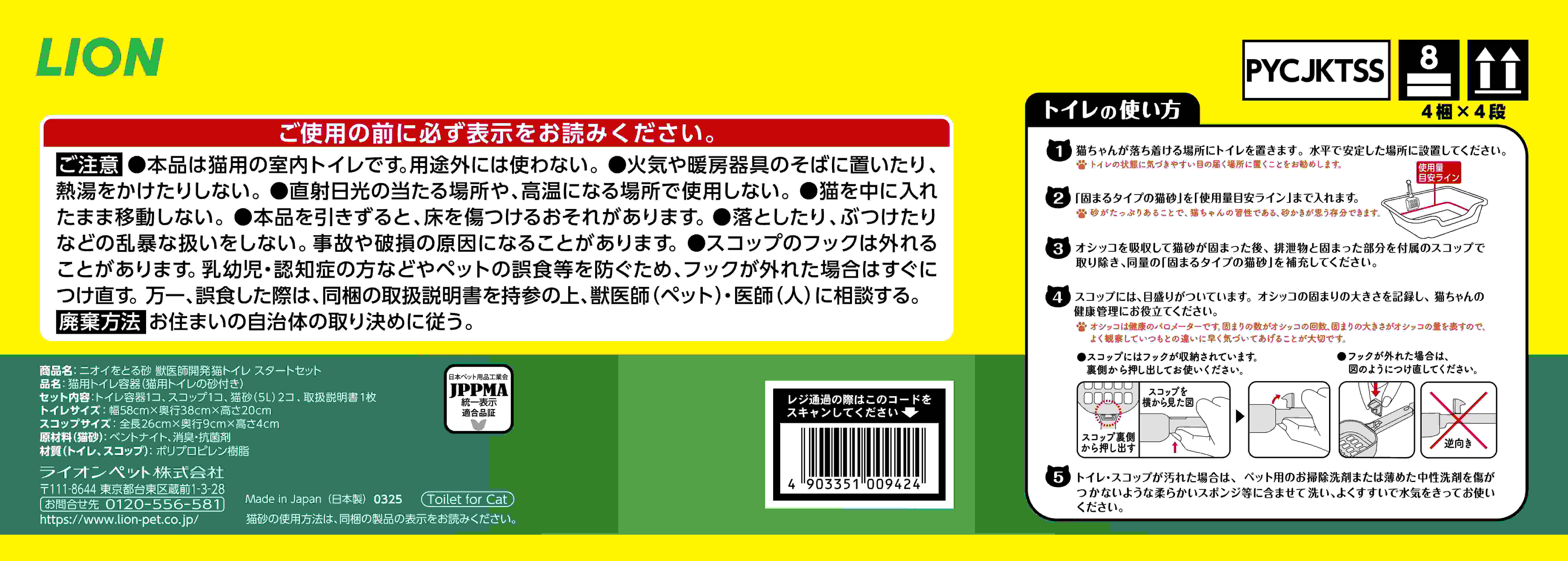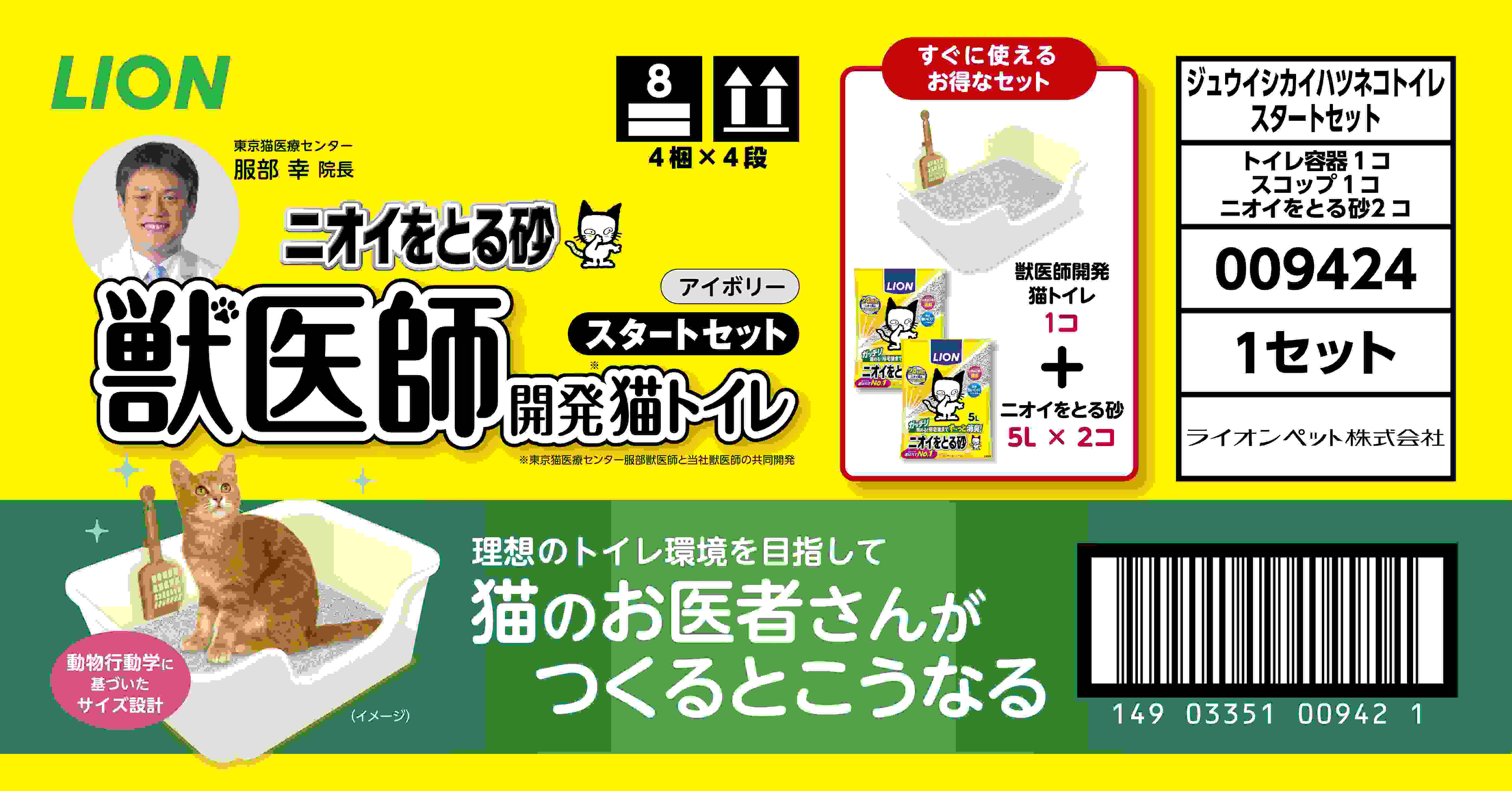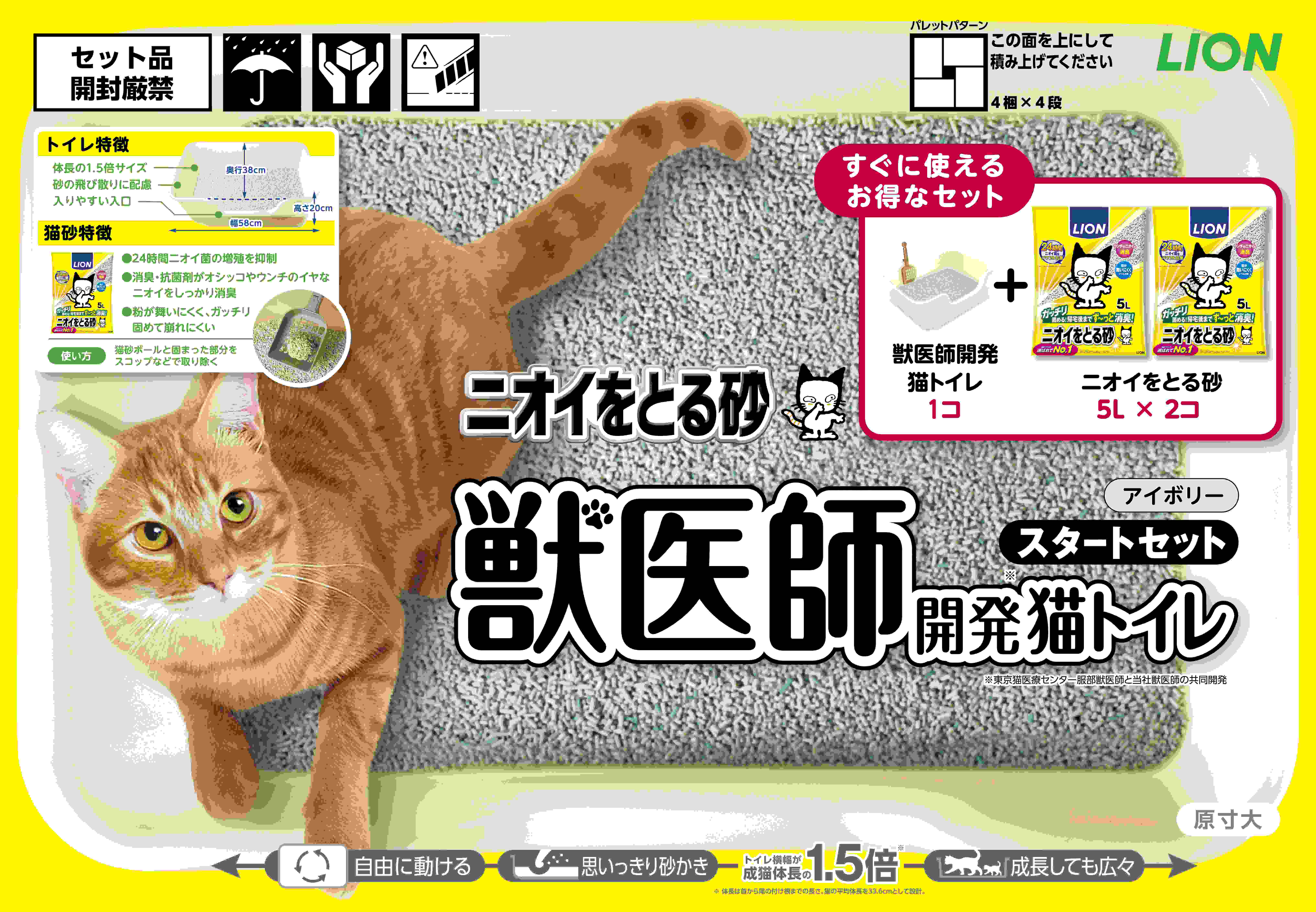 「猫ちゃんとオーナーにとって理想のトイレ環境を目指して」。東京猫医療センター服部獣医師と当 社獣医師の共同開発。 動物行動学に基づいたサイズ設計。猫ちゃんの体長の1.5倍*を想定したゆったりサイズ。「ニオイをとる砂5L 」が2 袋入りのお買い得なセット品。 *猫の平均体長を33.6cm として設計。