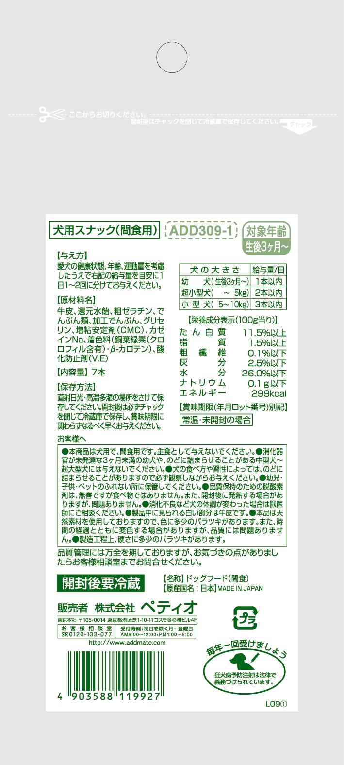 ●ペットフードとしての用途をお守りください。●生後3ヶ月未満の幼犬には与えないでください。●愛犬の食べ方や習性によっては、のどに詰まらせることがありますので必ず観察しながらお与えください。●幼児・子供・ペットのふれない所に保管してください。●品質保持のための脱酸素剤は、無害ですが食べ物ではありません。また、開封後に発熱することがありますが、問題ありません。●消化不良など愛犬の体調が変わったときは獣医師にご相談ください。●表面に白い粉が析出する場合がありますが、原料に含まれる成分(アミノ酸など)で、品質には問題ありません。●製品中に見られる斑点や粒状のものは鶏ササミの筋です。●製造工程上、色・形状・サイズ・硬さなどに多少のバラツキがあります。また、時間の経過とともに変色する場合がありますが、品質には問題ありません。