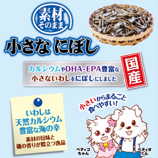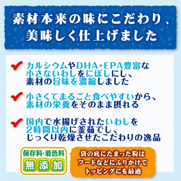 カルシウムやDHA・EPA豊富な小さないわしをにぼしにし、素材の旨味を濃縮しました。小さくてまるごと食べやすいから、素材の栄養をそのまま摂れる。国内で水揚げされたいわしを2時間以内に釜茹でし、じっくり乾燥させたこだわりの逸品。保存料・着色料無添加。