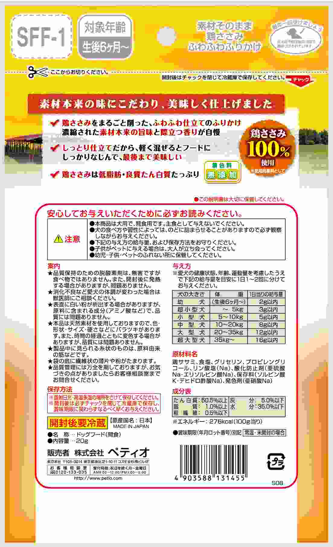 低脂肪・良質たん白質たっぷりな鶏ささみをまるごと削った、ふわふわ仕立てのふりかけ!濃縮された素材本来の旨味と際立つ香りが自慢!しっとり仕立てだから、軽く混ぜるとフードにしっかりなじんで、最後まで美味しい!着色料無添加。