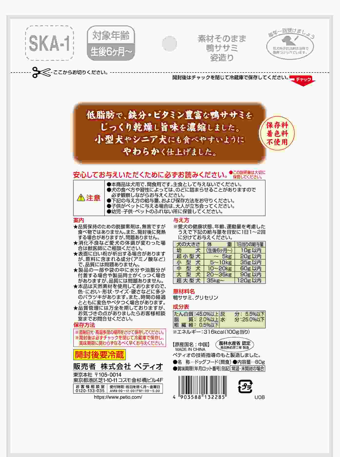 低脂肪で、鉄分・ビタミン豊富な鴨ササミをじっくり乾燥して旨味を濃縮しました。小型犬やシニア犬にも食べやすいようにやわらかく仕上げました。保存料・着色料不使用。農林水産省認定 鳥加熱処理工場製造。