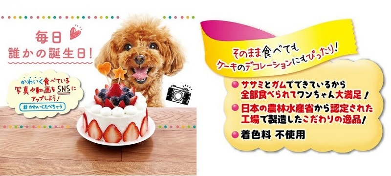 いろんな形のポップスティック! かわいく食べている写真や動画をSNSにアップしよう! ササミとガムでできているから全部食べられてワンちゃん大満足! そのまま食べてもケーキのデコレーションにもぴったり! かわいい5種類の形入り。着色料不使用。